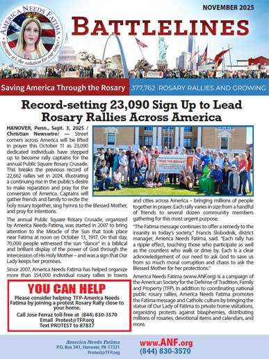 INSIDE: Defending the Faith Against Wolves -Protesting Pro-LGBTQ Father Martin at Catholic University • Alabama Rally Opposes Drag Queen Events • Captains Organize 1,376 Rosary Rallies to Honor Our Lady of Fatima • Honoring the Sacred Heart of Jesus at 1,550 Rosary Rallies • Creating a Legacy of Prayer in Louisiana • Forgotten Truths • From the Desk of Robert E. Ritchie • Over 500 Rosary Rallies Oppose Blasphemous Film, Dogma