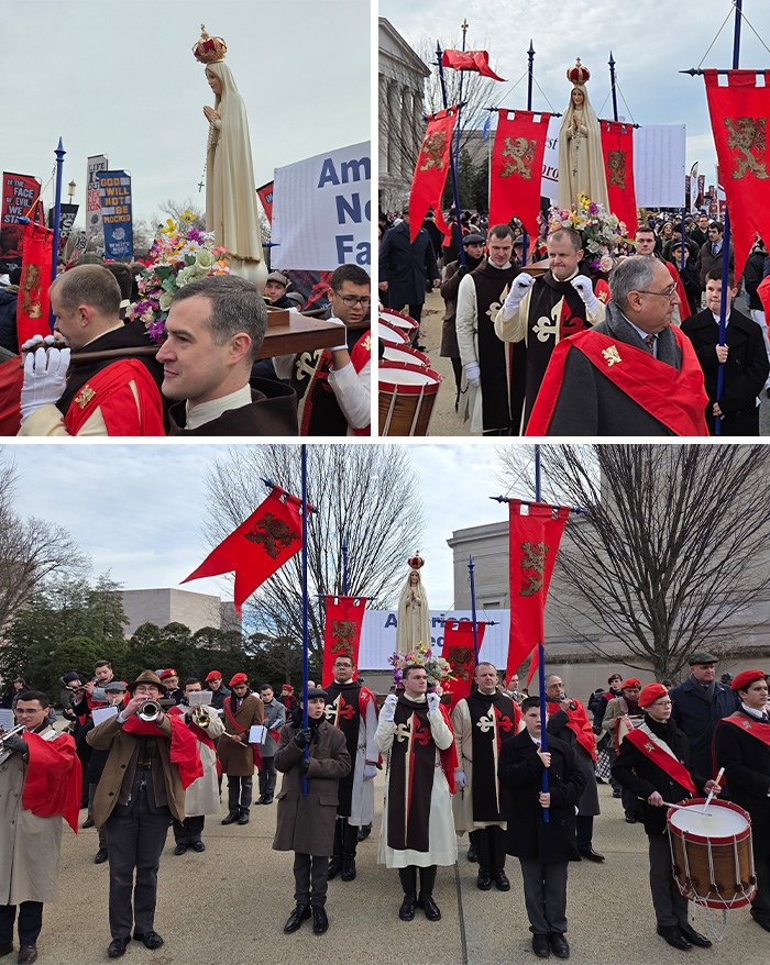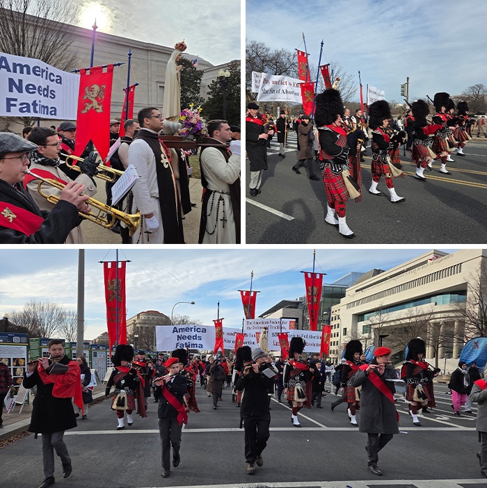 The American Society for the Defense of Tradition, Family and Property (TFP) joined the March for Life with a large contingent gathered around a beautiful statue of Our Lady of Fatima, its trademark 18-foot red standards, and the Holy Choir of Angels brass, drum, and bagpipe band.