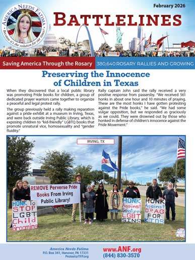 INSIDE: Connecticut Group Crushes Satan at Three Rallies Against Paranormal Cirque • Denouncing Boston Church for Sponsoring LGBTQ Ministry • One Rosary, One Soul Equals a Powerful Combination • First Time Captain Rallies Against Drag Show • UPDATE: SatanCon Kaput! Public Protests Work • Persevere in Prayer for Poor Sinners! - a personal message from Mary • From the desk of Robert E. Ritchie • VICTORY! Washington Court Blocks Attempt to Force Priests to Violate the Seal of Confession